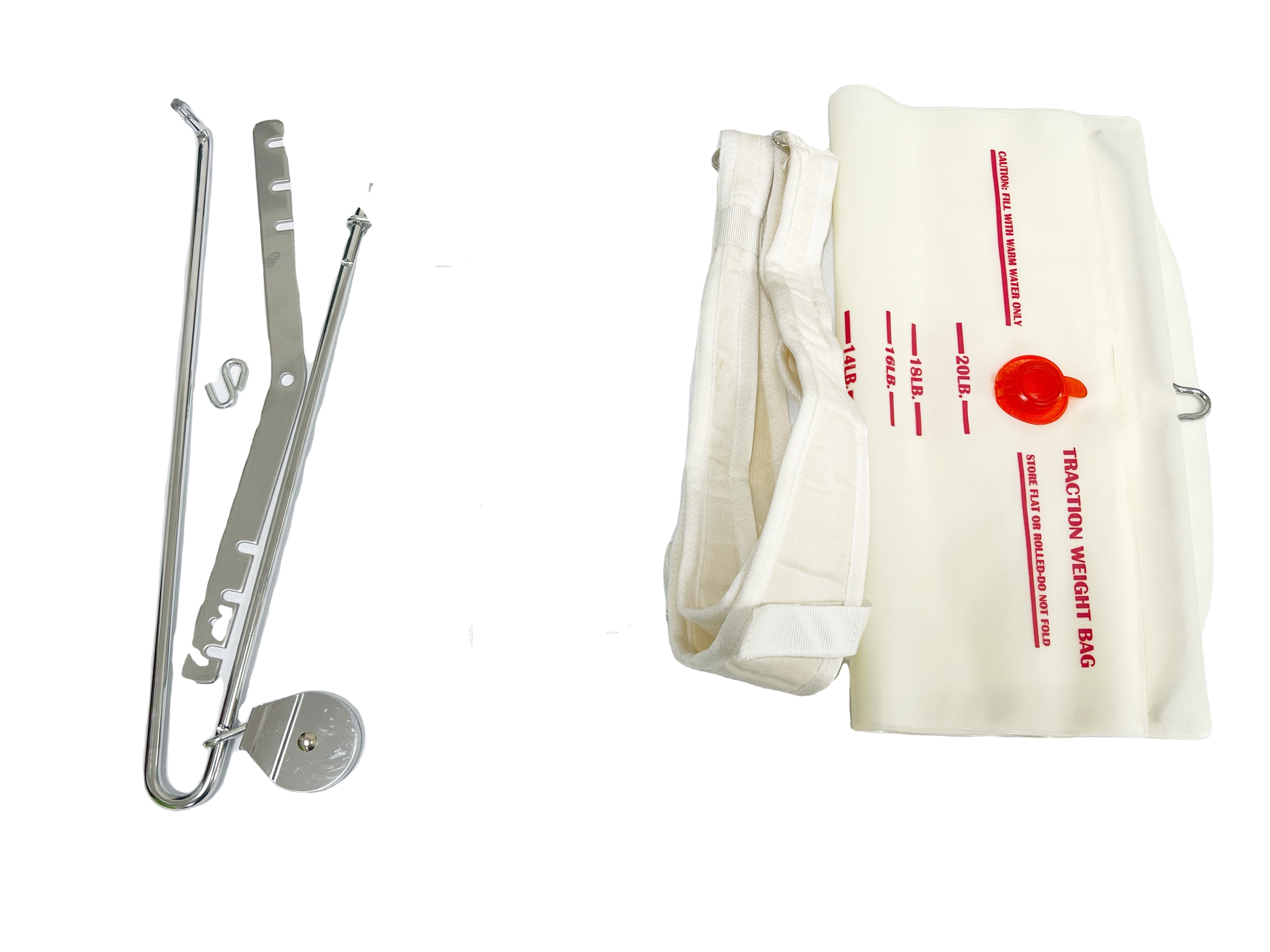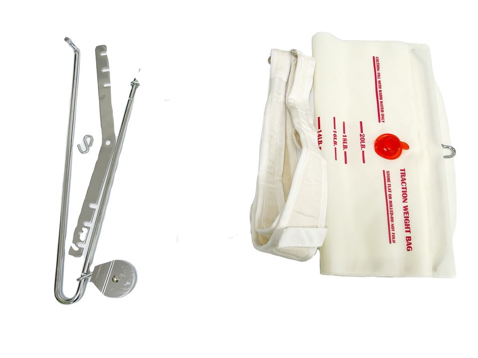 * Includes: 12-inch adjustable spreader bar, 8-feet of traction rope, double-sealed rings, water bag, “S” hook, a metal support, and self-attaching closures