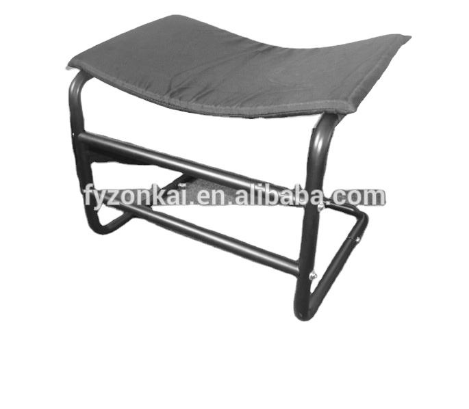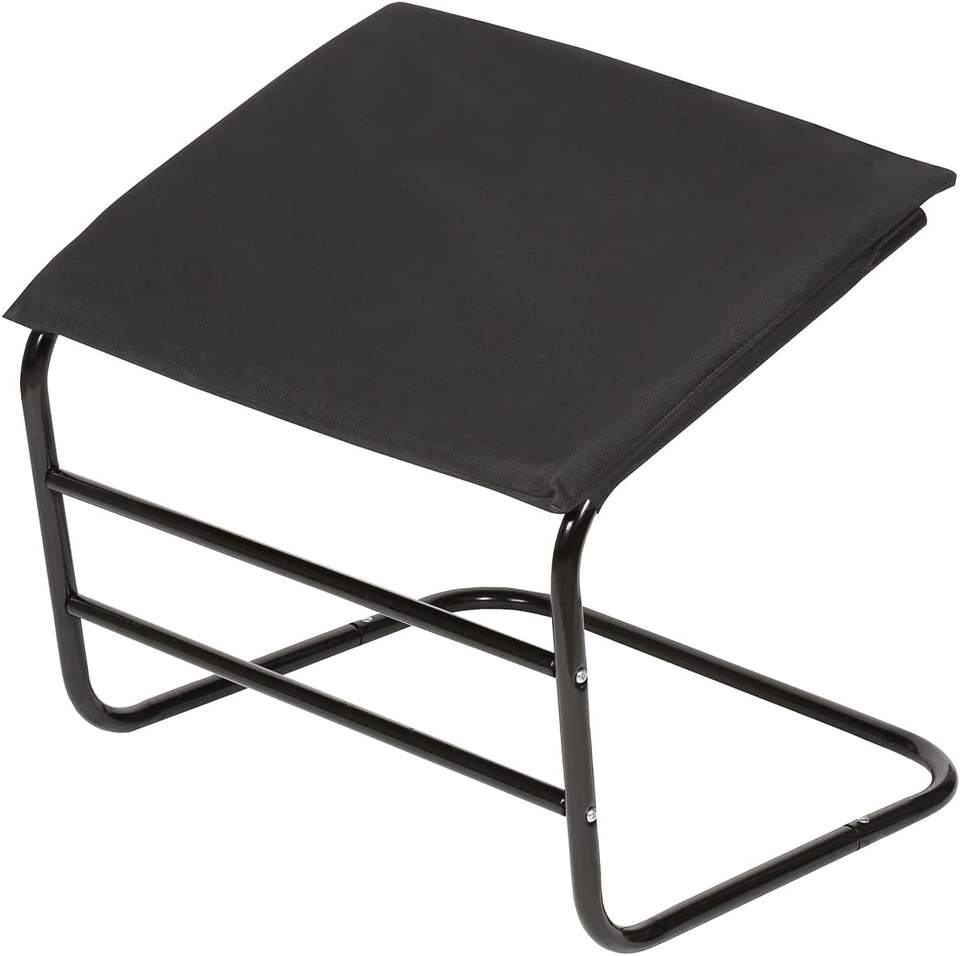 * PADDED FOOTSTOOL - black leg rest has a padded foot rest that is covered in soft black fabric. The tubular metal frame is strong and lightweight, for a portable foot rest that you can use in any room or as an outdoor footstool on a porch or covered patio.